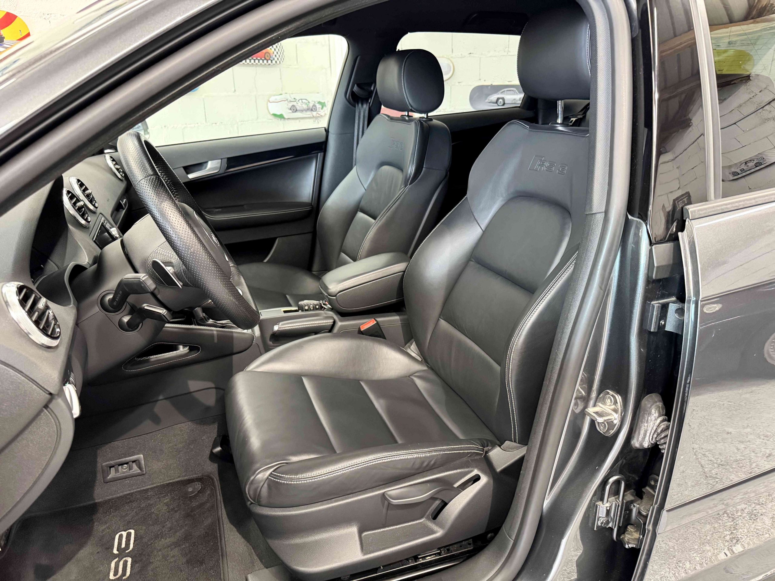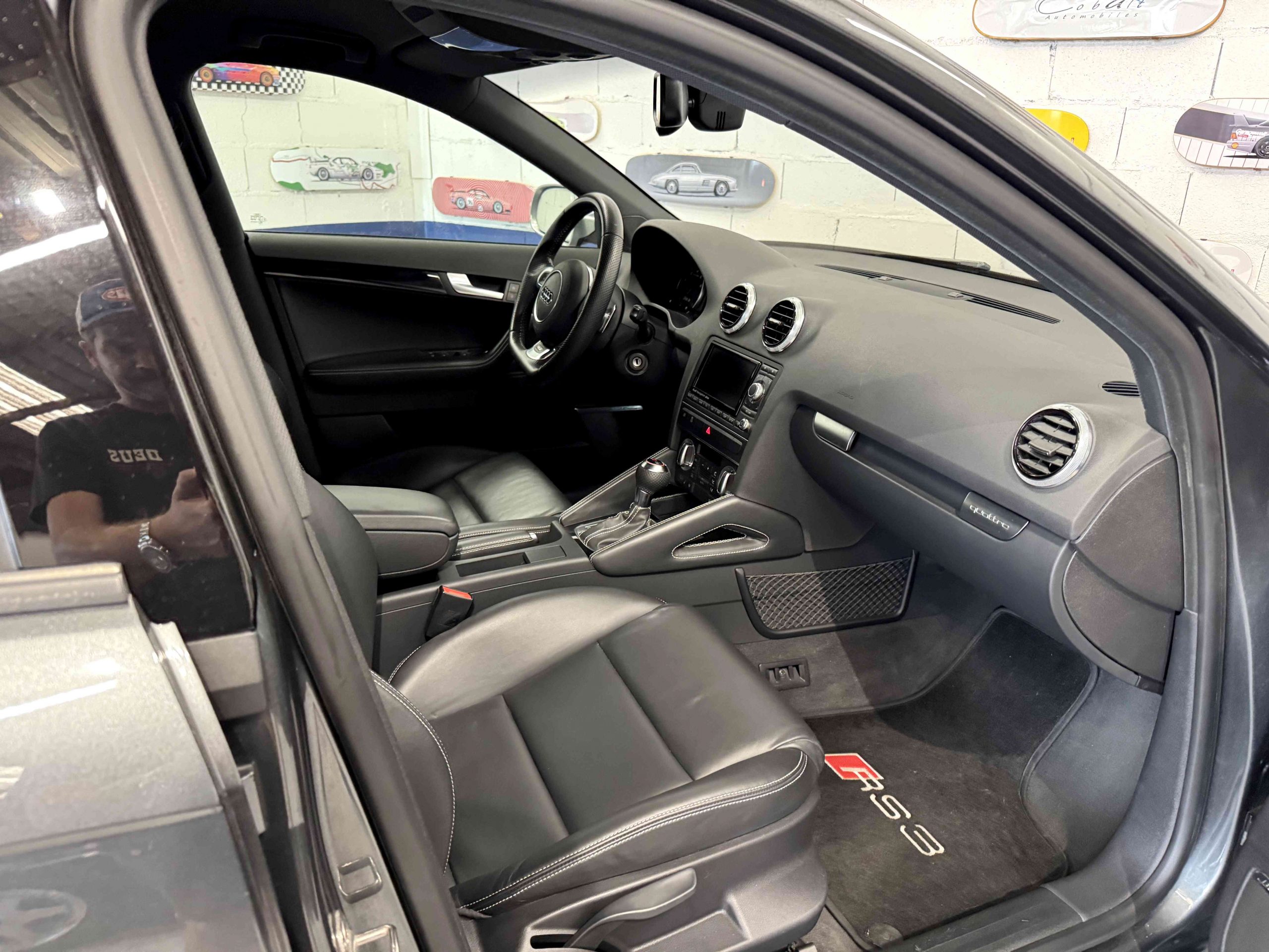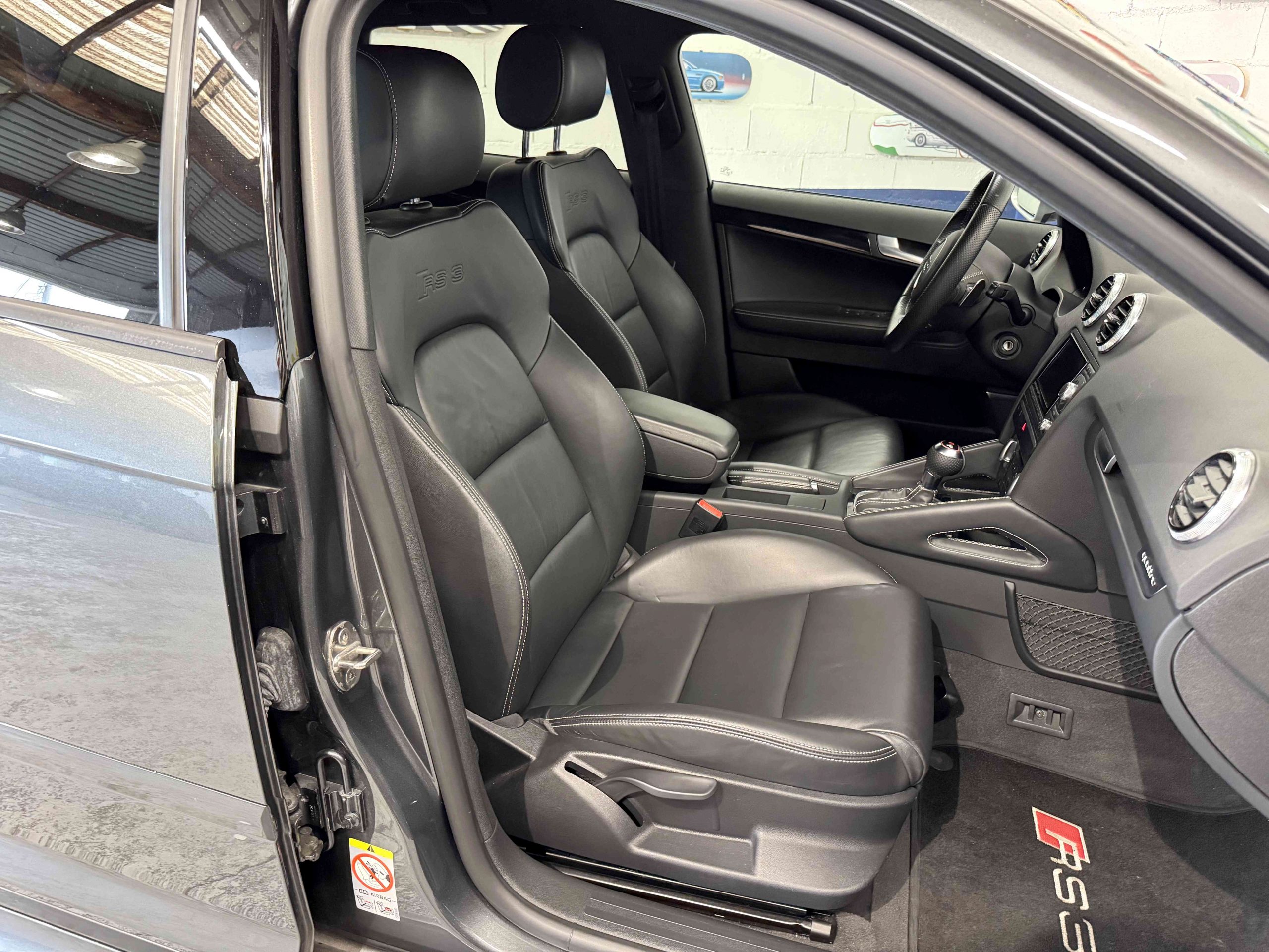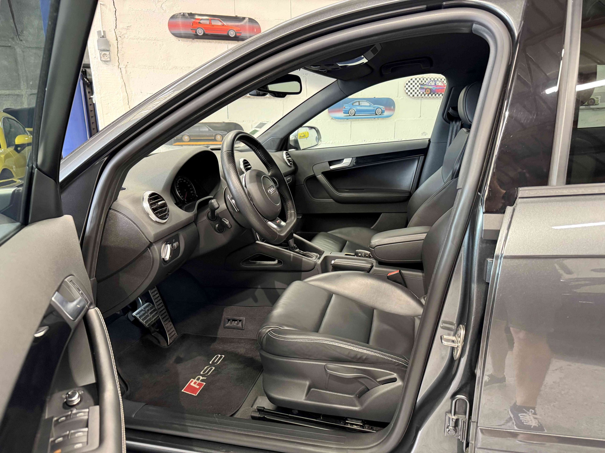 - Couronne de volant, pommeau, soufflet de levier de vitesses et manchette de frein à main en cuir Audi exclusive