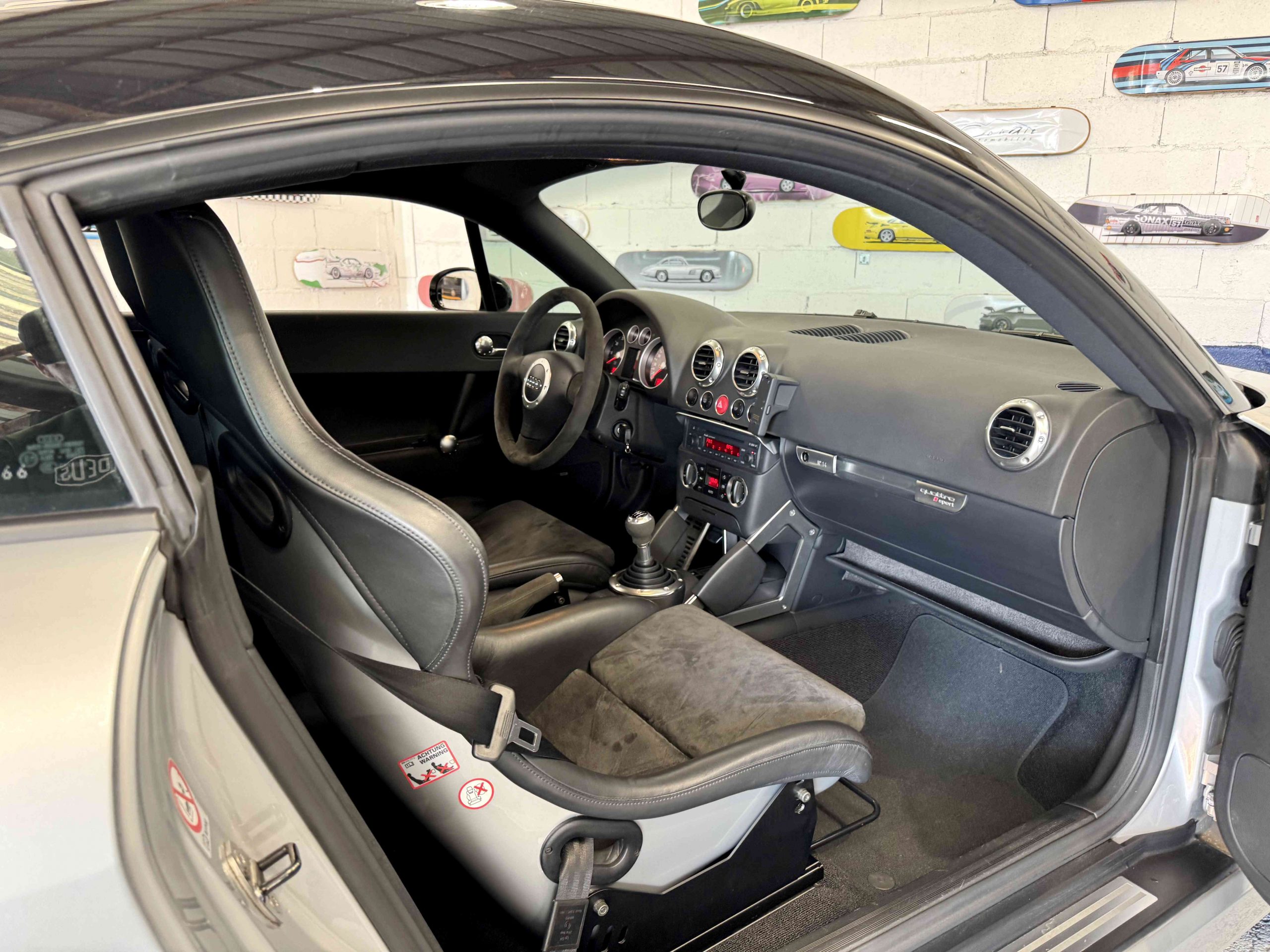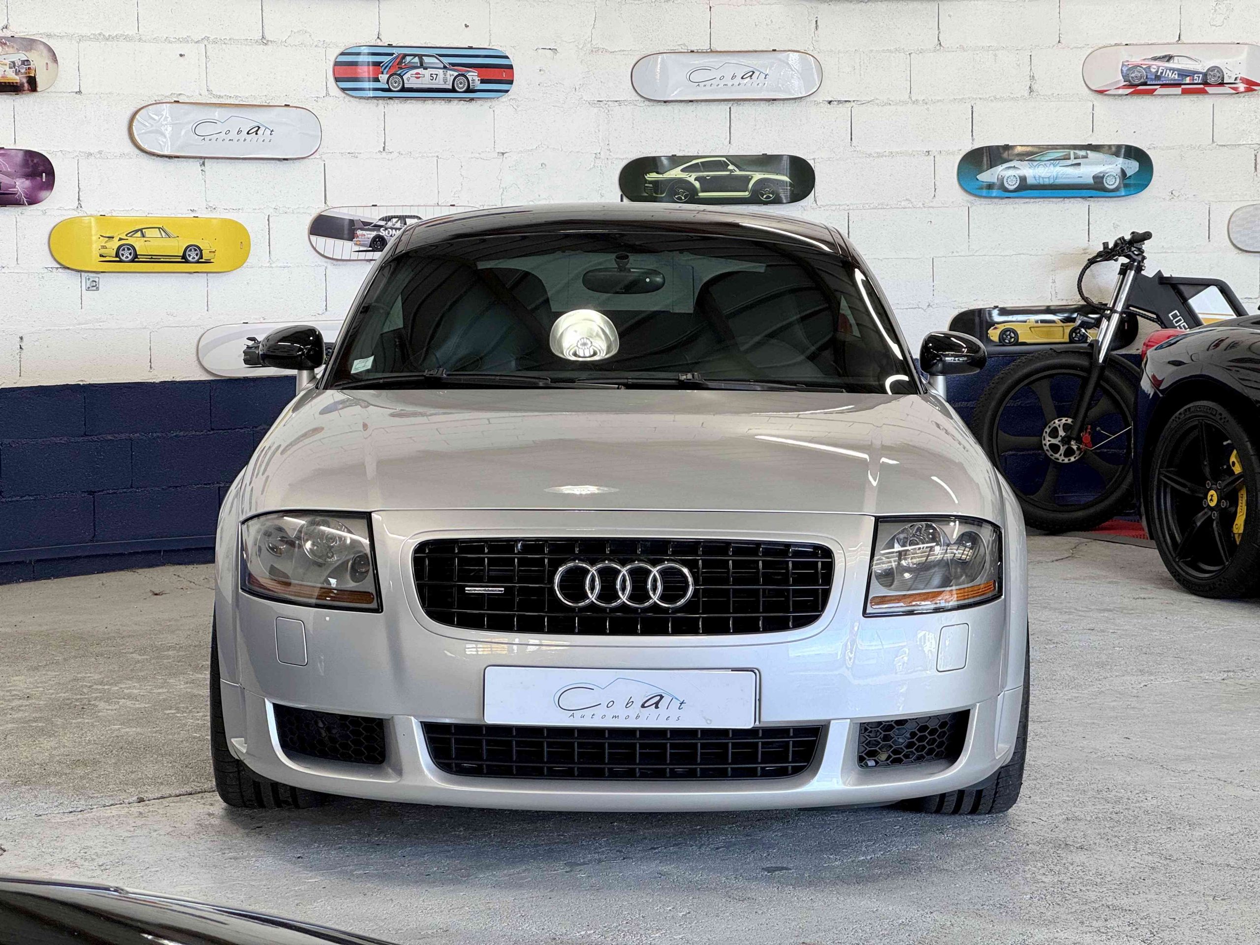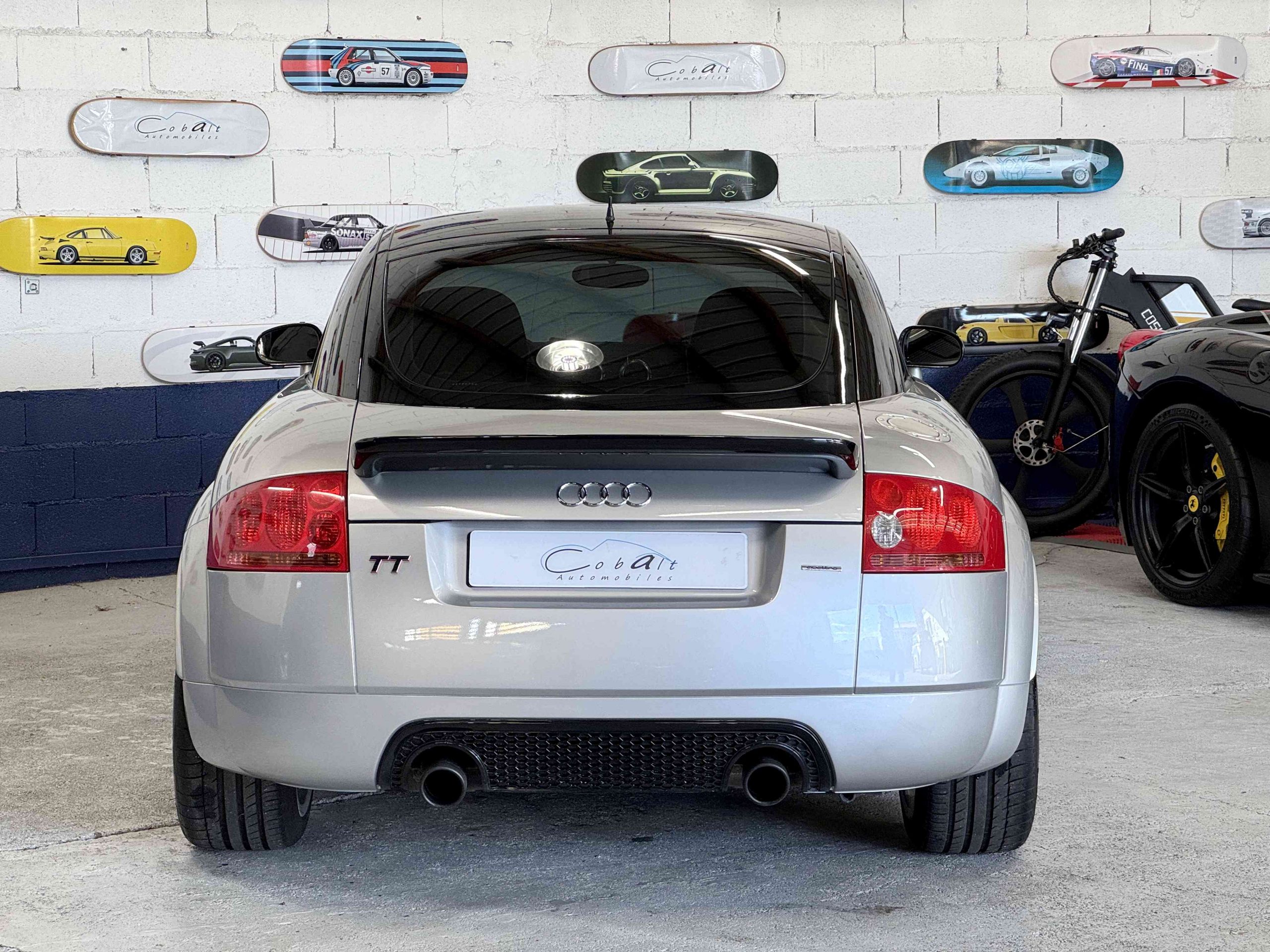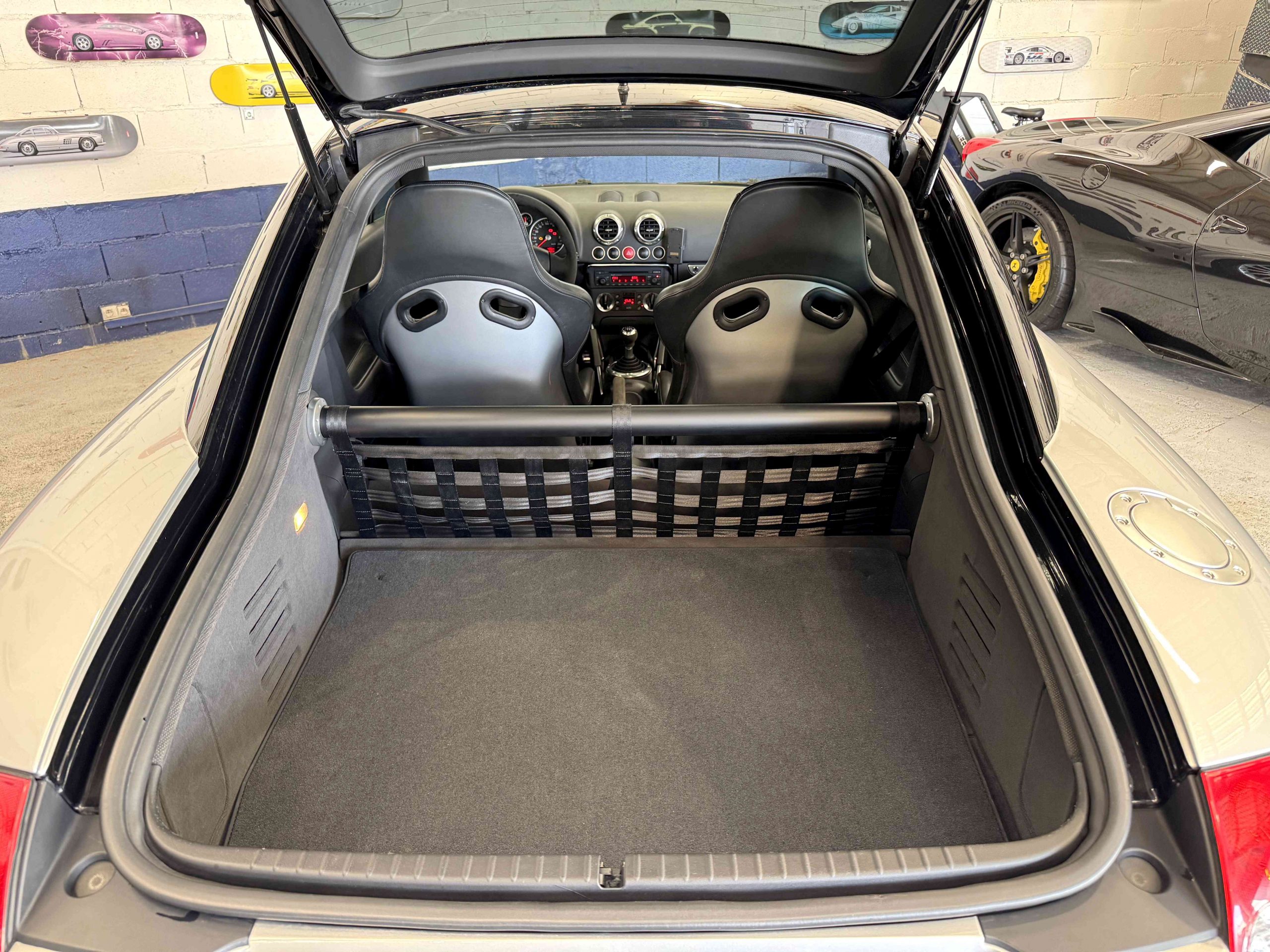 En 2005, pour fêter les 25 ans du système Quattro, Audi, par le biais de Quattro GmbH, décide de concentrer tout son savoir faire dans le TT. Le résultat est probant : une cure d’allègement de 75kg, un moteur qui passe de 225 ch à 240 ch. Suppression des airbags latéraux de la climatisation automatique (disponible en options gratuite dont notre exemplaire est équipé), sièges Recaro, suppression de la banquette arrière, volant et pommeau de levier de vitesse en alcantara, barre anti-rapprochement et filet de séparation font partie de la liste des changements de l’habitacle de cette version ultime de l’Audi TT, une sorte de mini GT3 RS. Audi en profite pour ajouter 15 ch au moteur et l’étagement des 6 rapports de la boîte manuelle sont resserrés. Au niveau train roulant et châssis, la batterie est déportée à l’arrière, les jantes 18 pouces sont spécifiques comme le réglage de suspension (-20 mm) conférant à ce TT un caractère jusque là inconnu pour ce modèle. Audi produira 1 165 TT Quattro sport dont 900 en conduite à droite et 24 exemplaires pour le marché Français, les seuls numérotés.