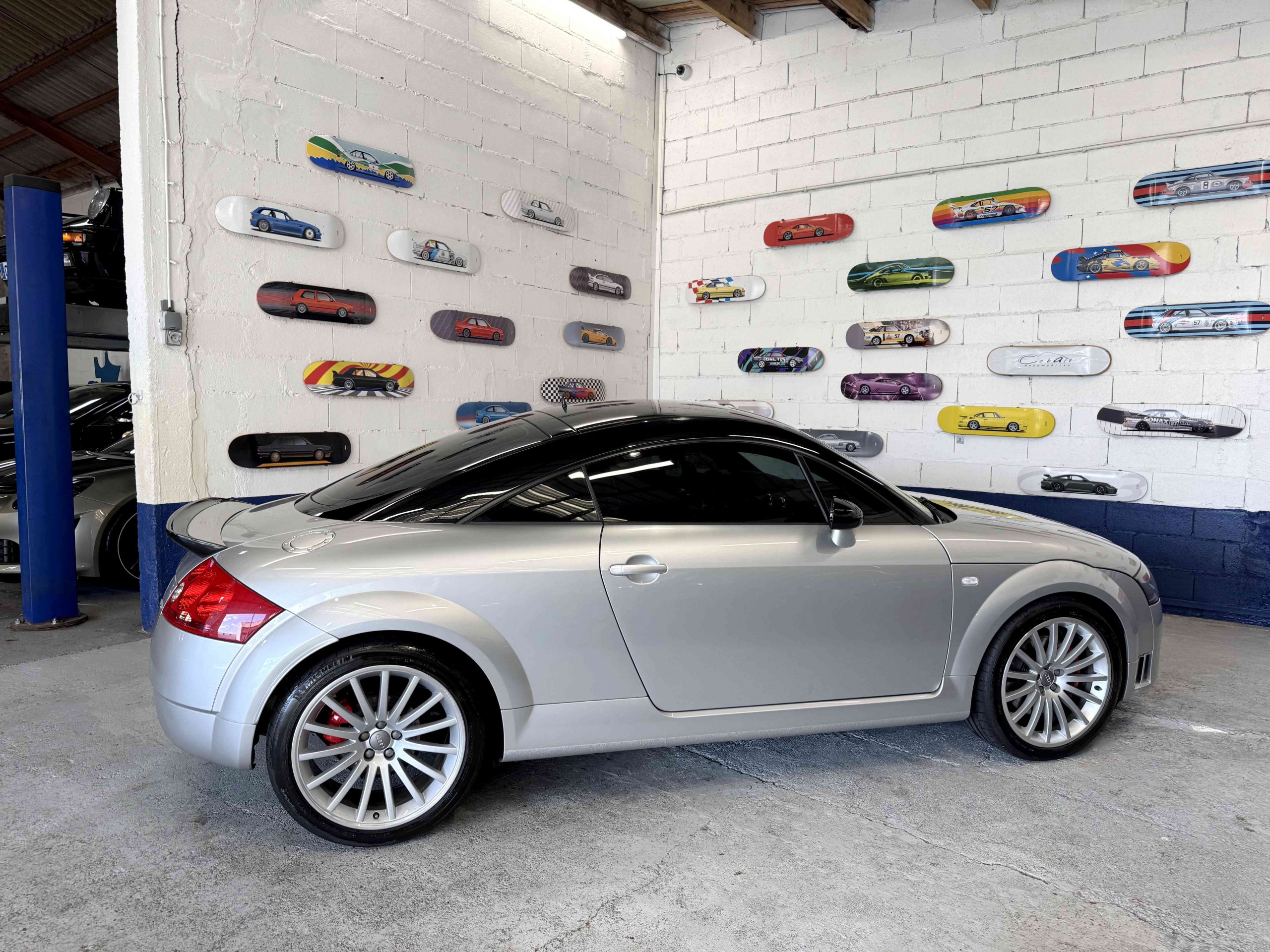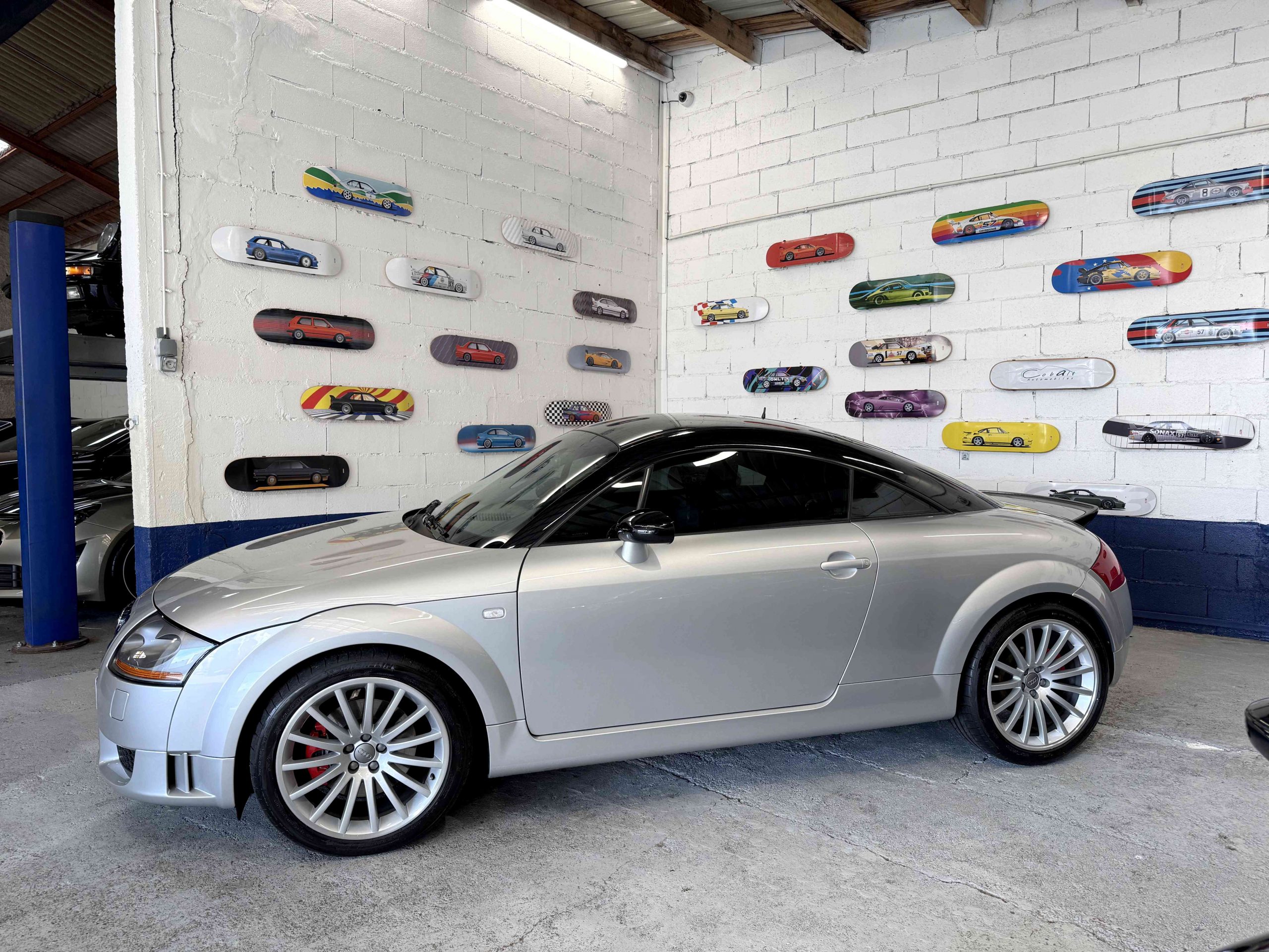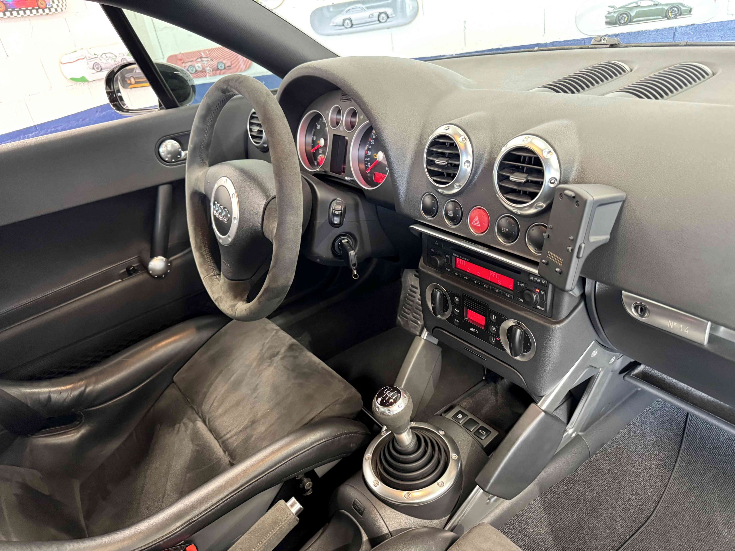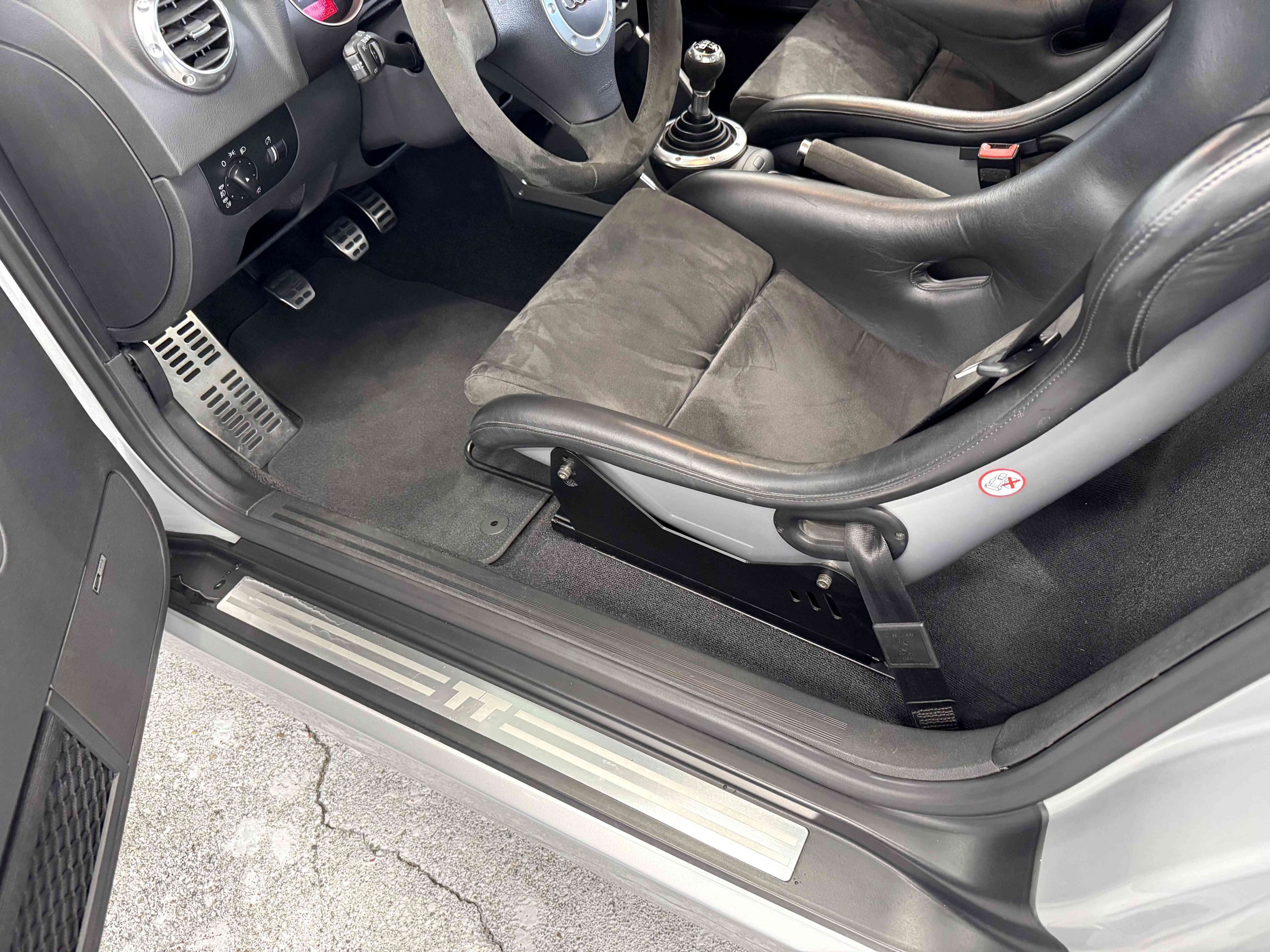 En 2005, pour fêter les 25 ans du système Quattro, Audi, par le biais de Quattro GmbH, décide de concentrer tout son savoir faire dans le TT. Le résultat est probant : une cure d’allègement de 75kg, un moteur qui passe de 225 ch à 240 ch. Suppression des airbags latéraux de la climatisation automatique (disponible en options gratuite dont notre exemplaire est équipé), sièges Recaro, suppression de la banquette arrière, volant et pommeau de levier de vitesse en alcantara, barre anti-rapprochement et filet de séparation font partie de la liste des changements de l’habitacle de cette version ultime de l’Audi TT, une sorte de mini GT3 RS. Audi en profite pour ajouter 15 ch au moteur et l’étagement des 6 rapports de la boîte manuelle sont resserrés. Au niveau train roulant et châssis, la batterie est déportée à l’arrière, les jantes 18 pouces sont spécifiques comme le réglage de suspension (-20 mm) conférant à ce TT un caractère jusque là inconnu pour ce modèle. Audi produira 1 165 TT Quattro sport dont 900 en conduite à droite et 24 exemplaires pour le marché Français, les seuls numérotés.