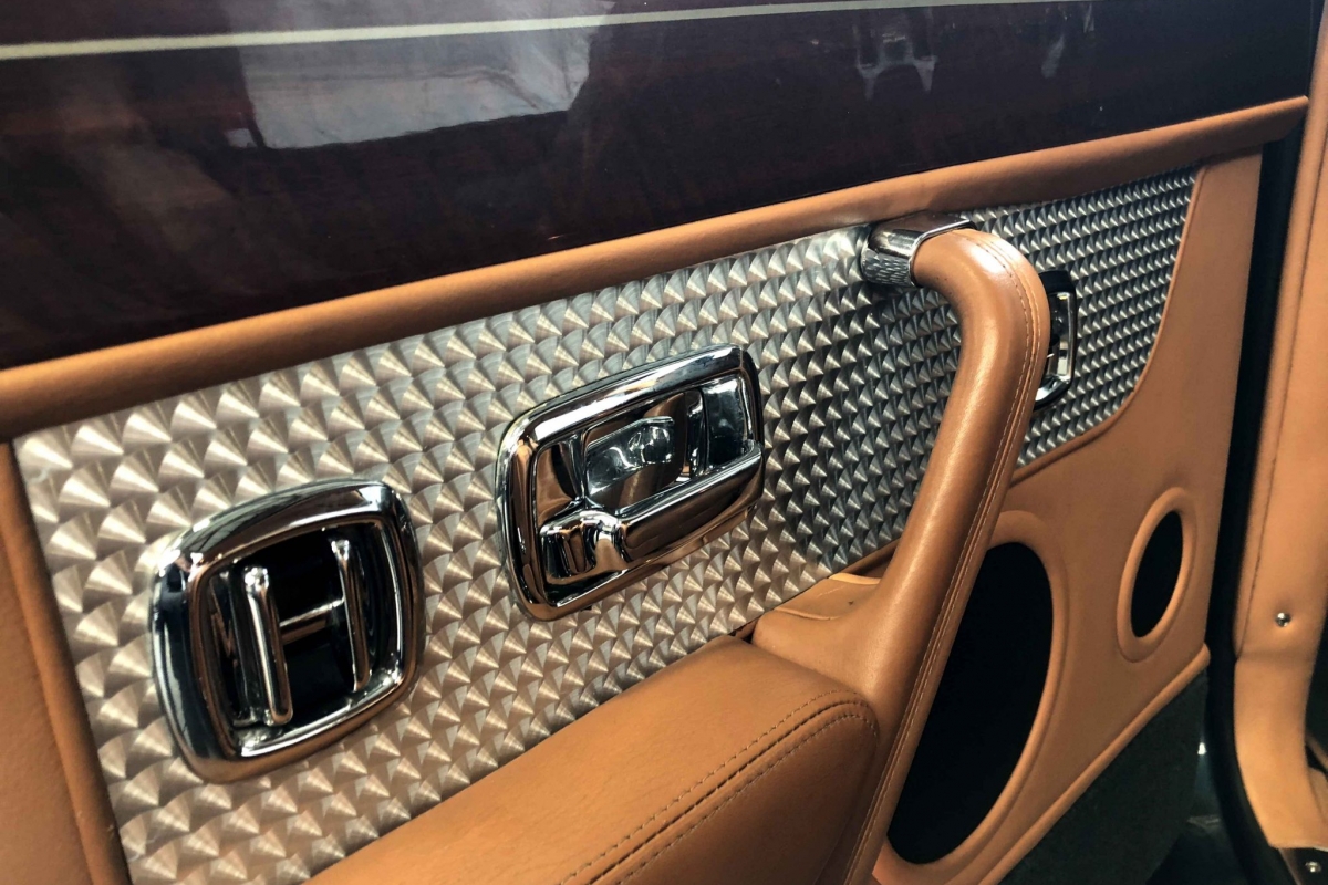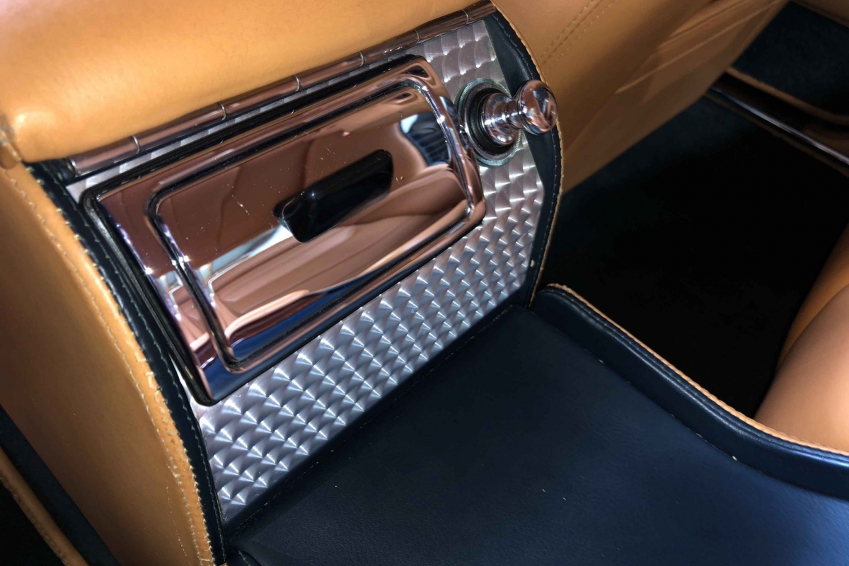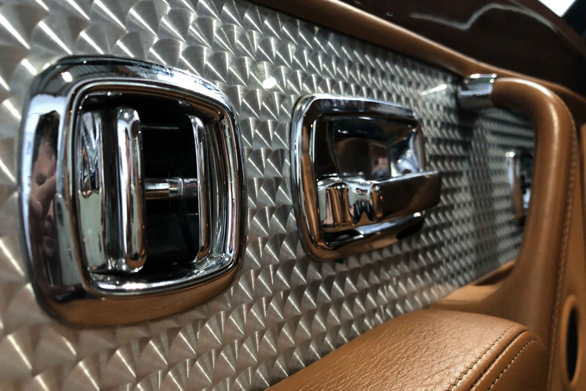 La configuration est sans faute avec les cuirs en deux nuances de beige, le bois précieux et l’indispensable finition en aluminium bouchonné.