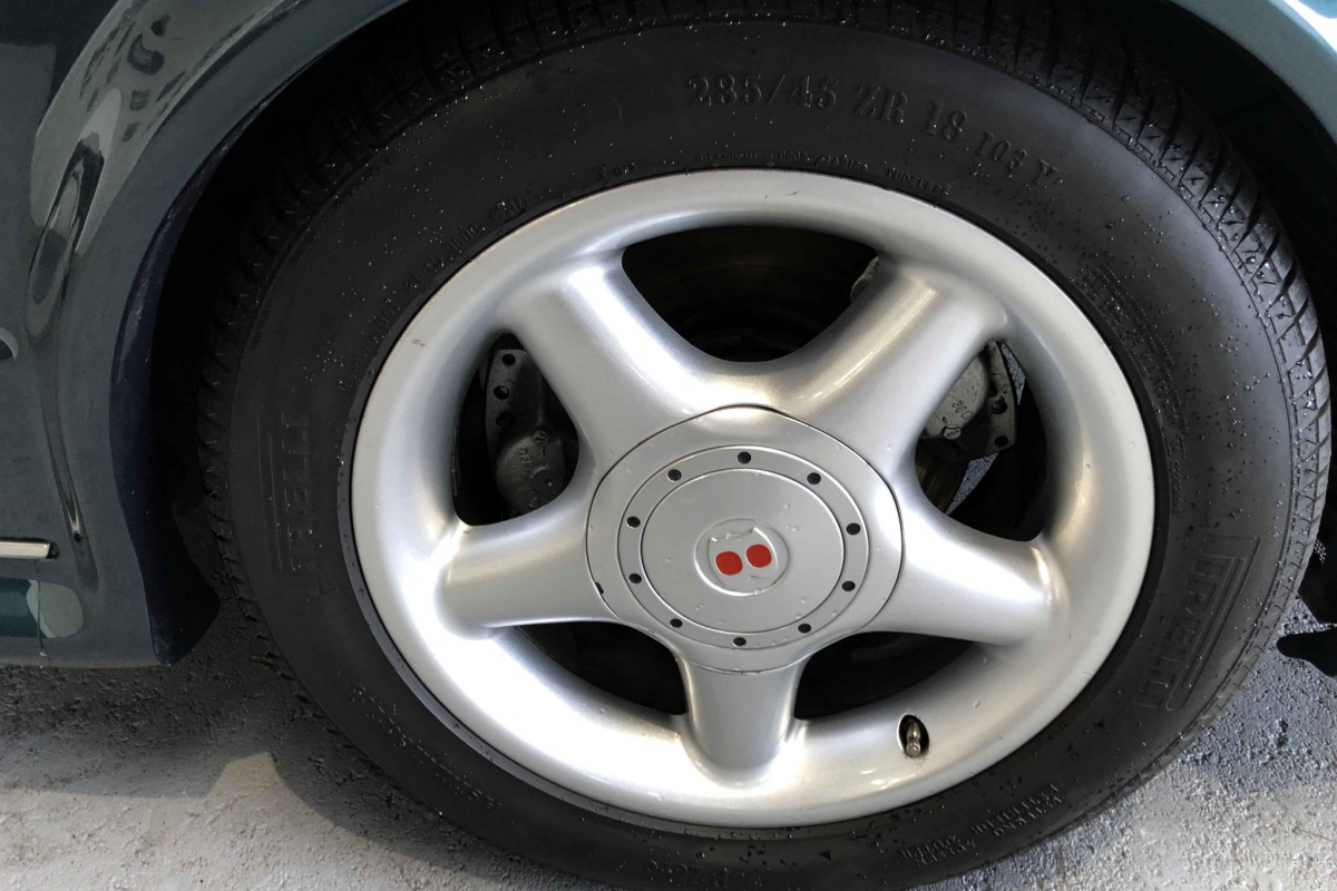 La peinture a été refaite il y a quelques années, elle a conservée tout son éclat et présente très bien comme les jantes (un petit accro sur une jante). Pas de trace d’accident ou de réparation, les ajustements et alignements sont parfaits. Quelques impacts de gravillons sur le bas des ailes arrières.
