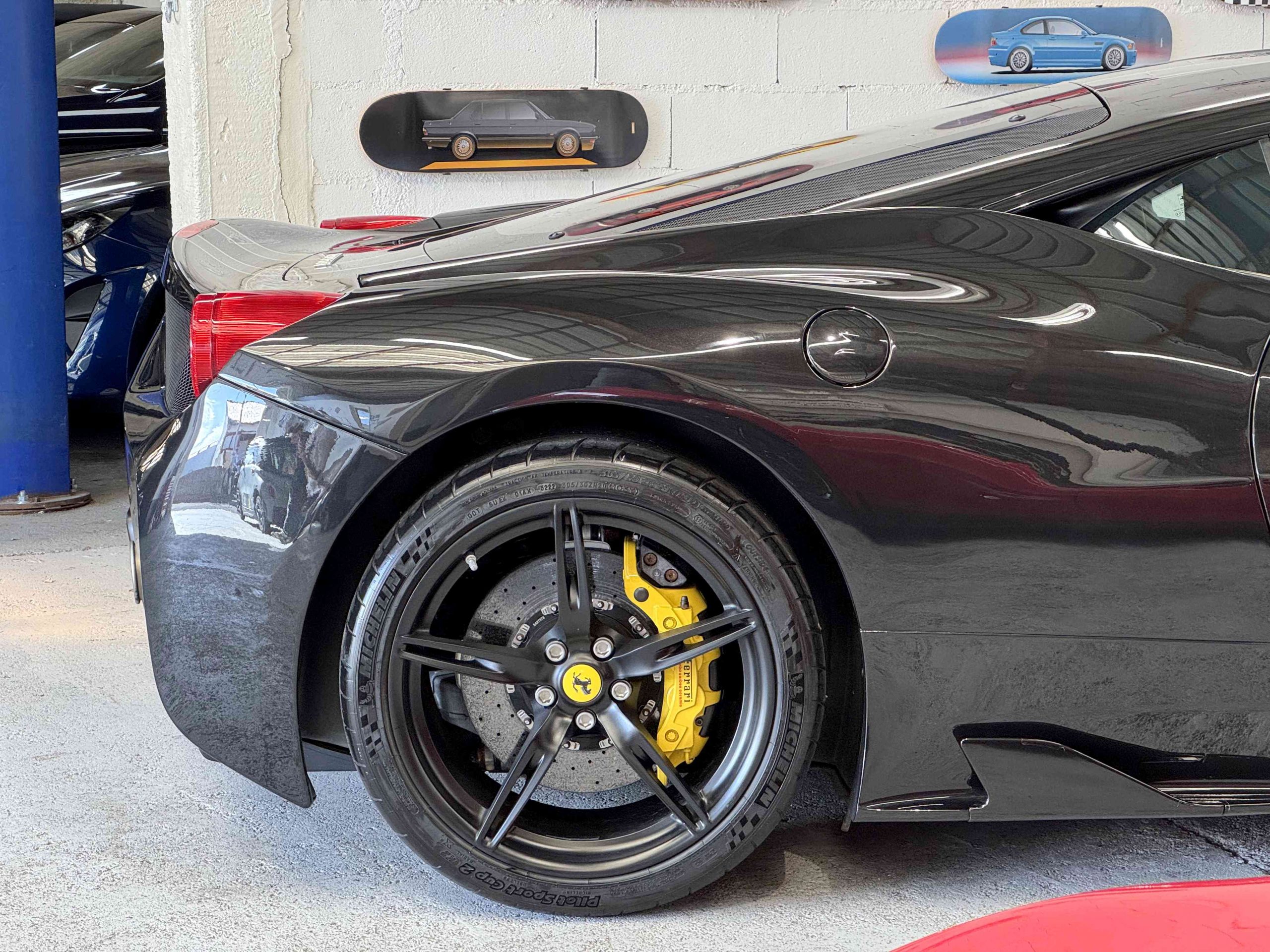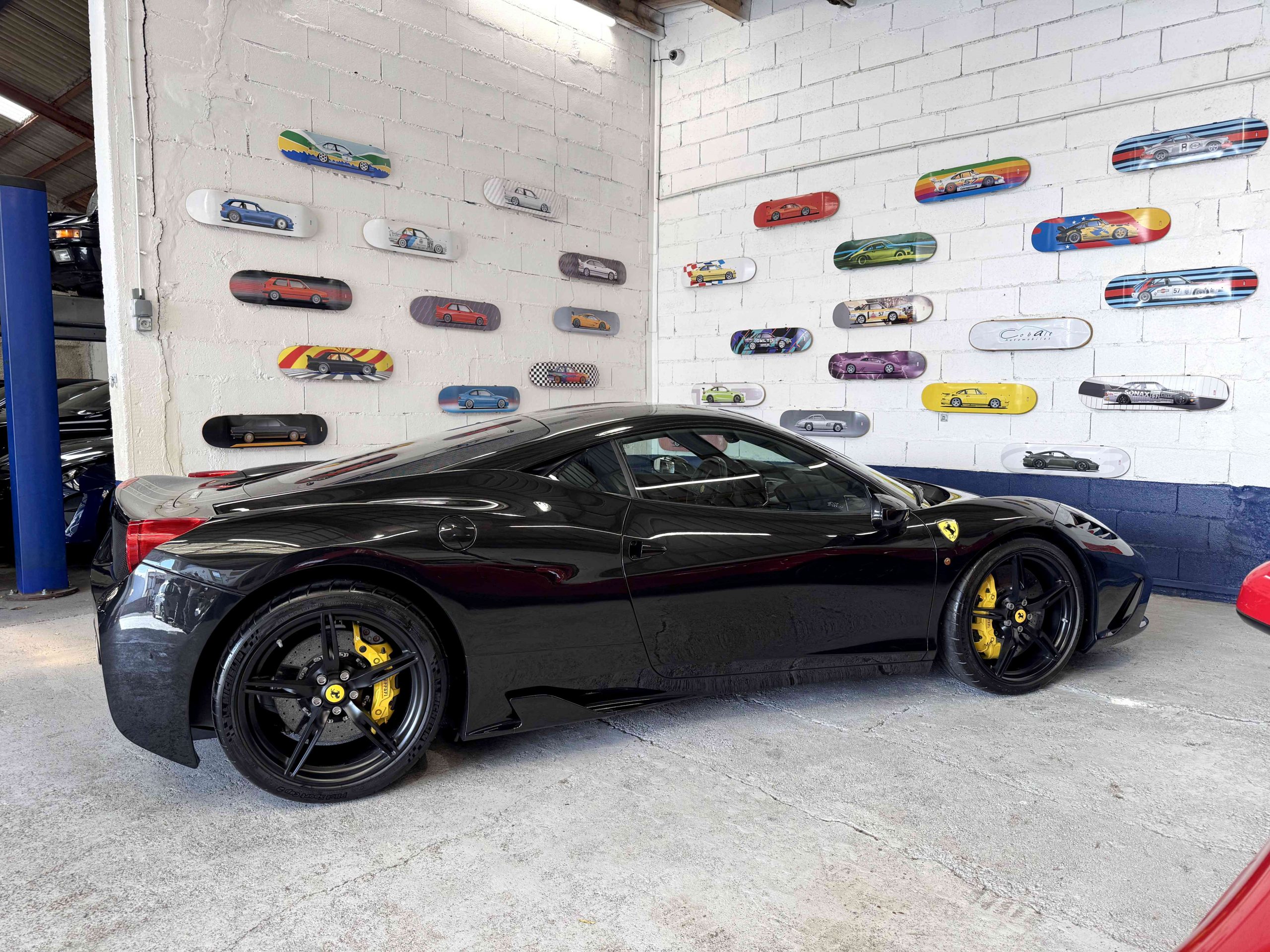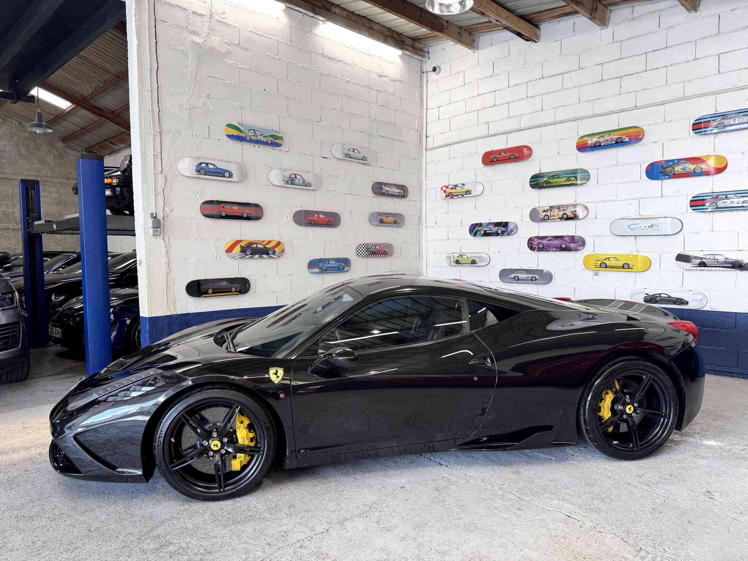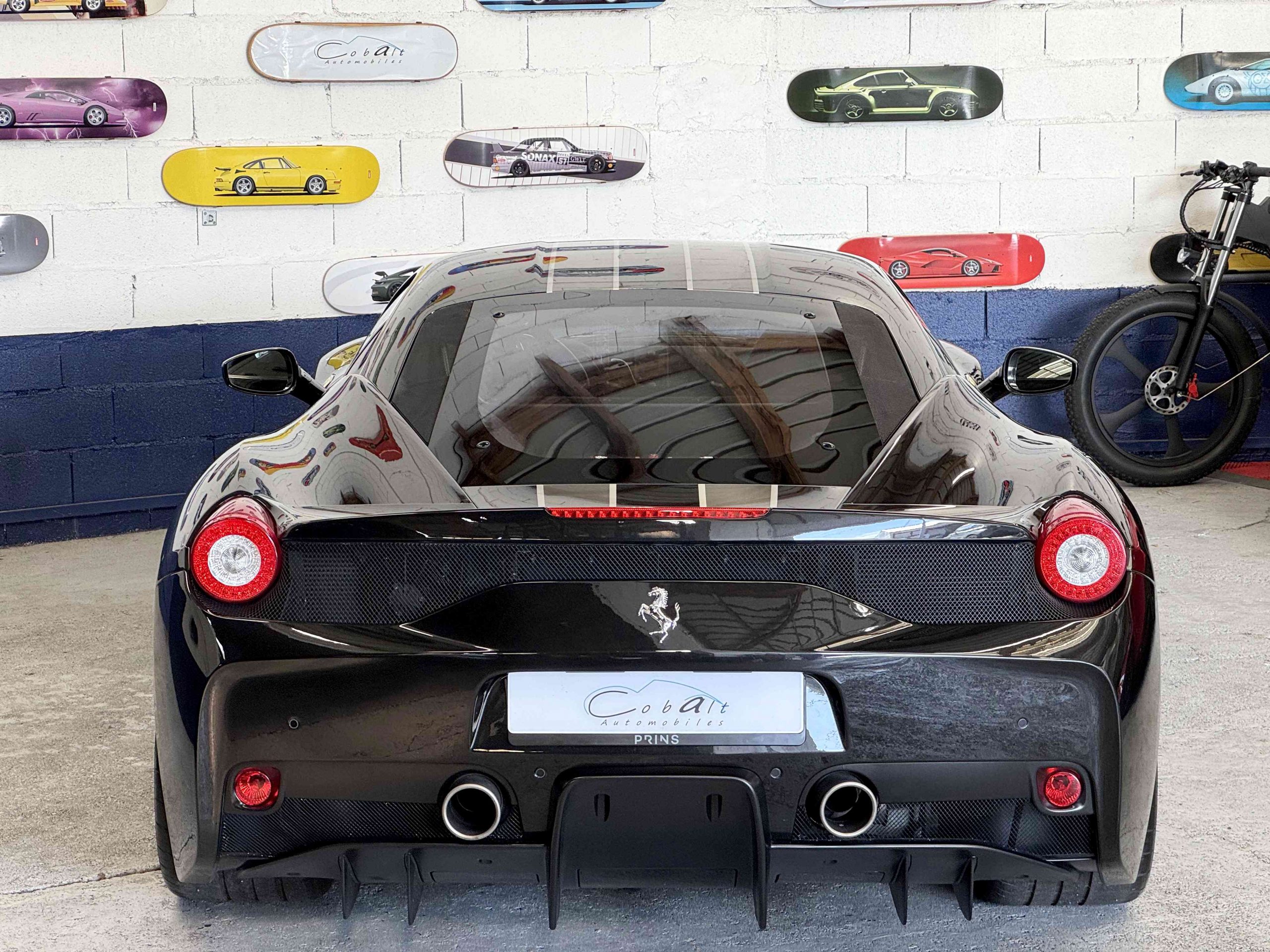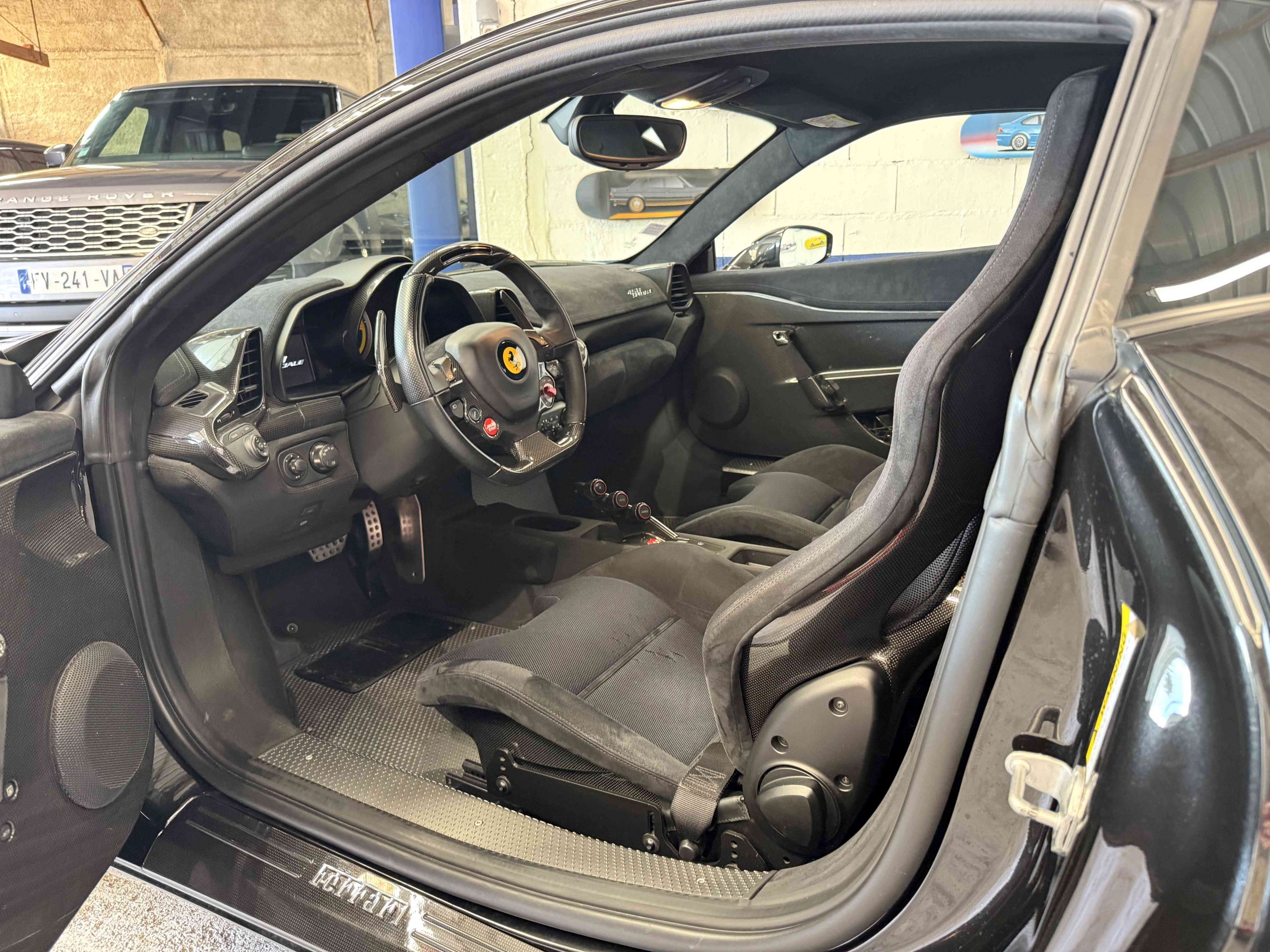 De plus en plus prisée par les collectionneurs, cette Ferrari 458 Spéciale a en effet tous les attributs pour plaire : allégement drastique, dernier moteur atmosphérique poussé dans ses limites permettant un gain de 35ch et une multitude d’améliorations aérodynamiques. Sa configuration full black avec les bandes racing et les harnais accentue son côté bestial et son esprit racing non usurpé !