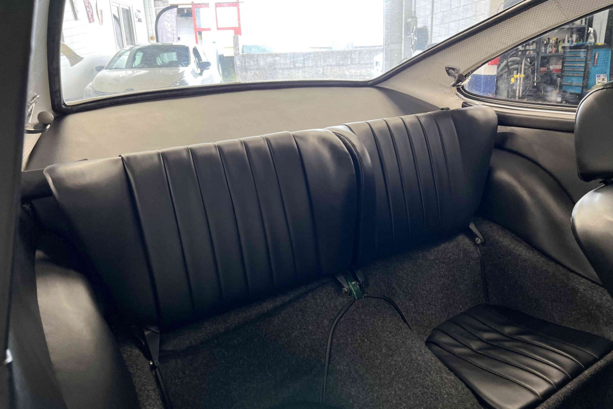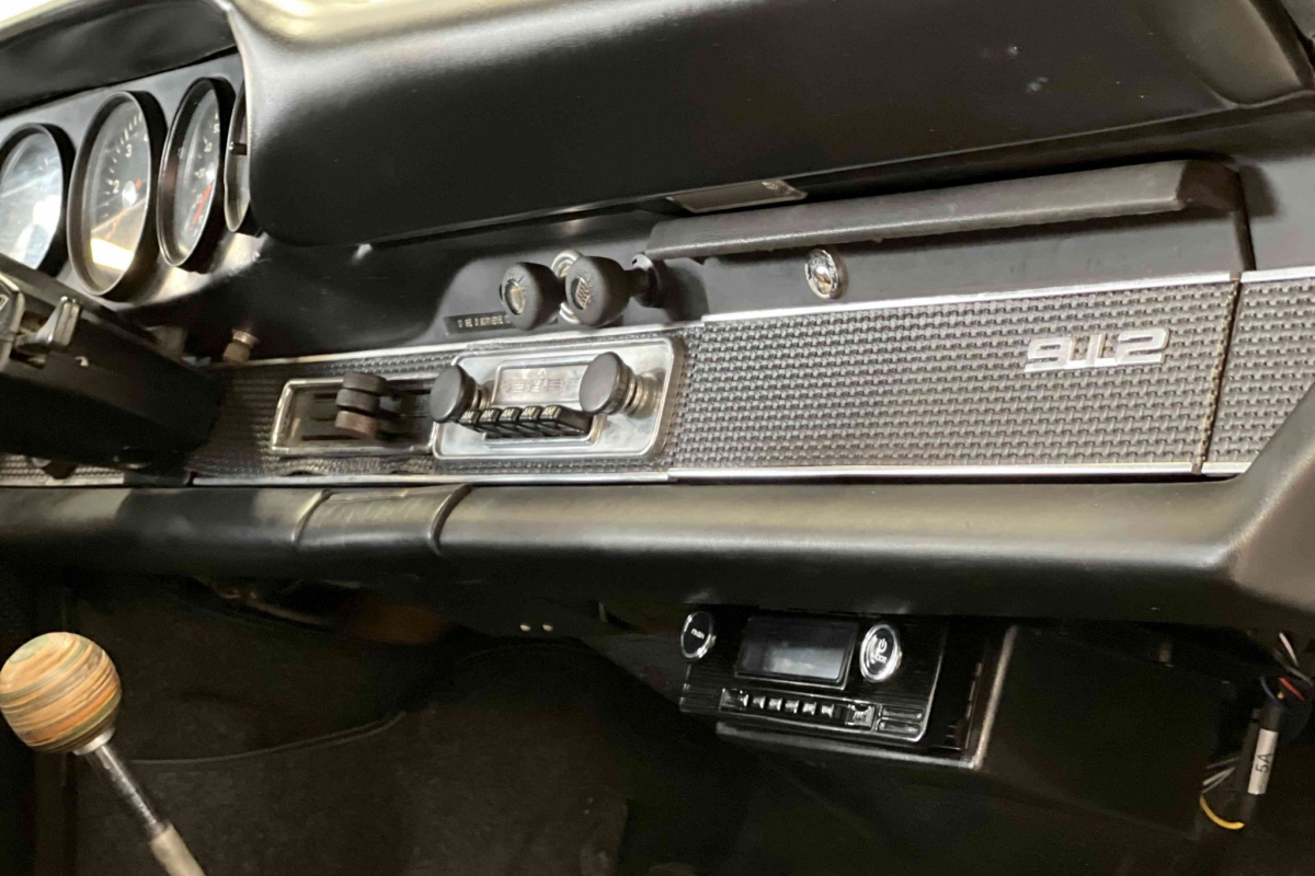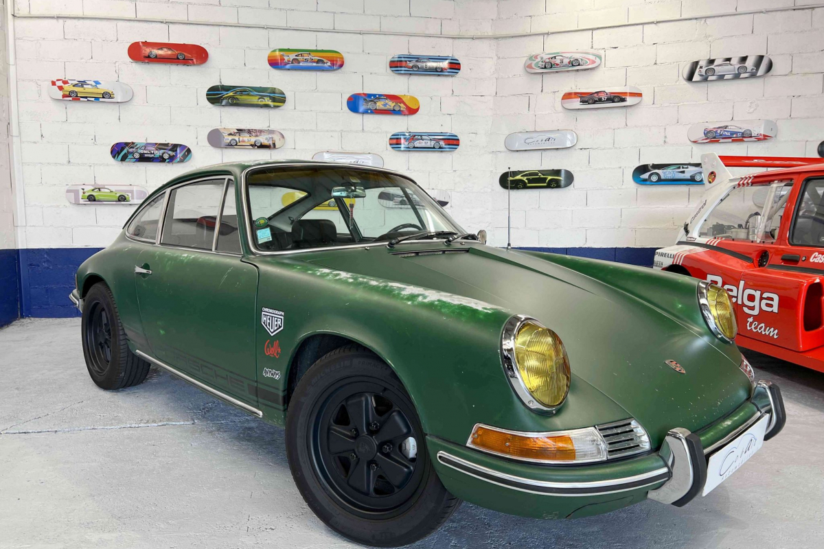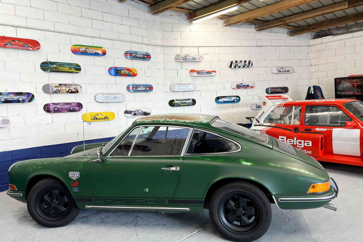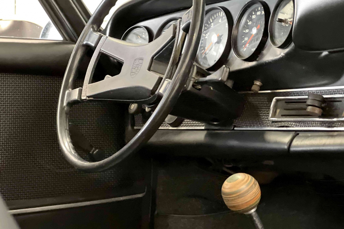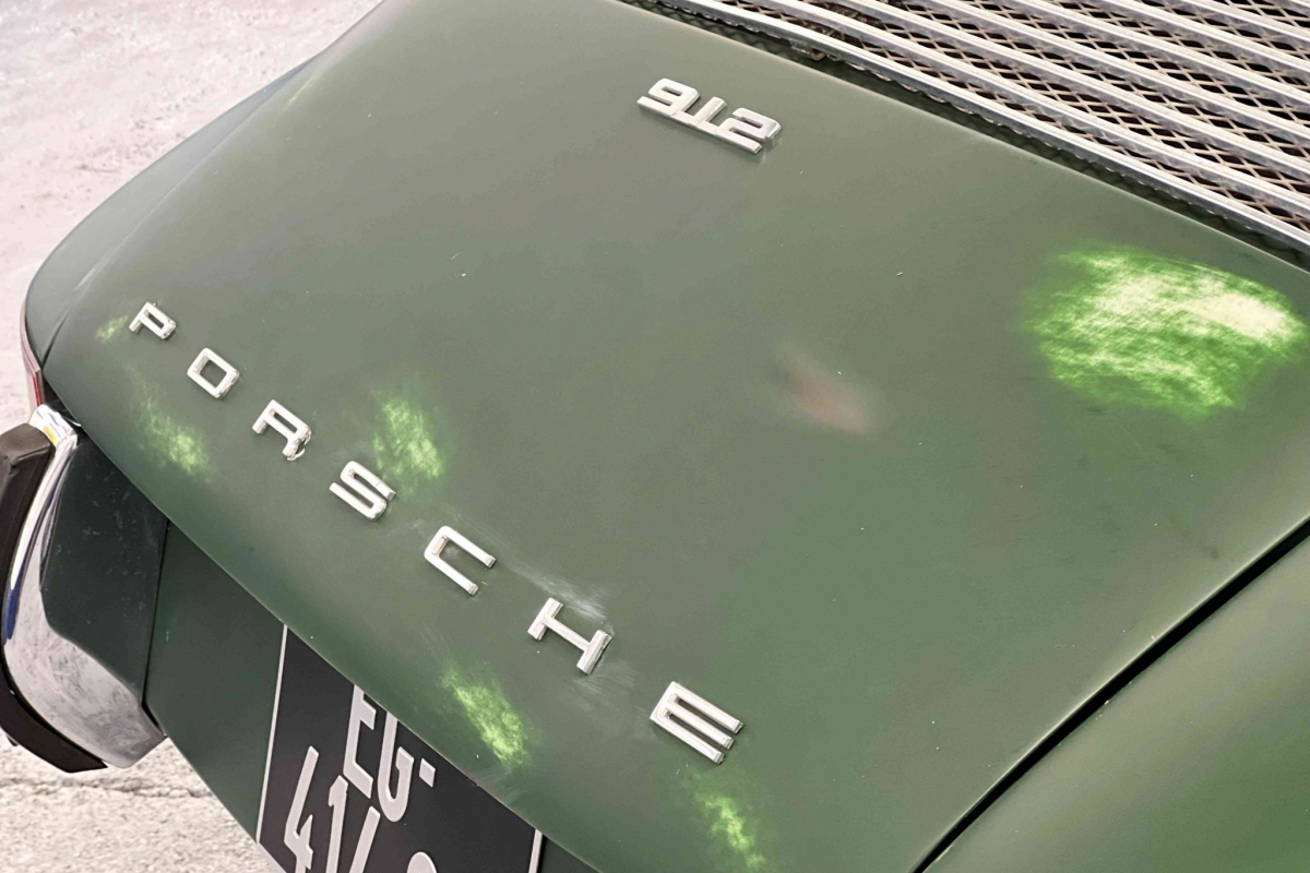 Produite en 1969, cette Porsche 912 a commencé sa vie aux USA. Elle sera méticuleusement détenue et entretenue par la même famille jusqu’en 2016. Preuve en est, nous disposons de quelques factures d’entretiens d’époque mais surtout d’un carnet d’origine rempli de A à Z avec des relevés de compression régulière agrafés dans ce dernier. En 2016, elle sera rachetée par la seconde et actuelle main. La caisse étant saine et la patine d’origine du véhicule étant très belle, ce dernier décide de sauvegarder ce rare état d’origine. Il fera vernir la caisse afin de garder l’aspect esthétique original de l’auto et de lui rendre un style unique, voir artistique !